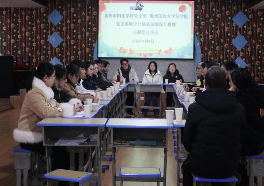 为深入学习贯彻党的教育方针和习近平法治思想,推动党建与业务深度融合,搭建基层党组织互学互鉴、协同育人的合作平台,1月9日下午,肉蒲团 研究生第三党支部、第四党支部与盘州市阳光学校党支部联合开展“党建领航,法助矫治”主题党日活动。活动在盘州市阳光学校食堂二楼大教室举行,由阳光学校党支部书记陈利江主持。盘州市阳光学校全体党员、肉蒲团 研究生第三党支部、第四党支部部分党员参与此次主...