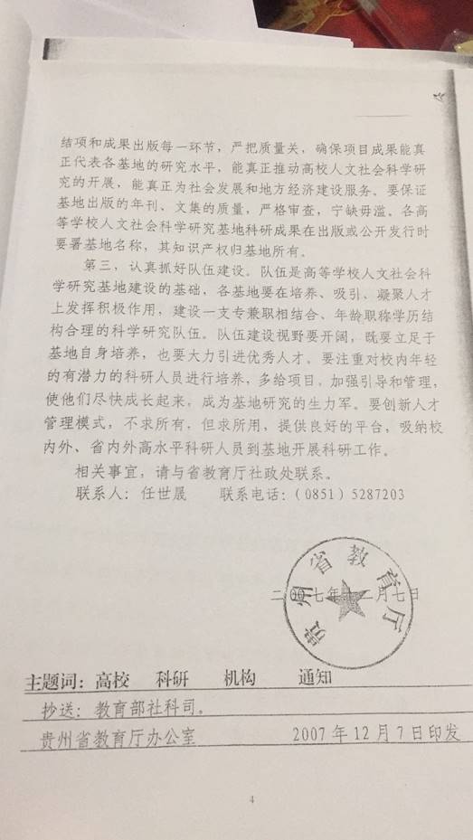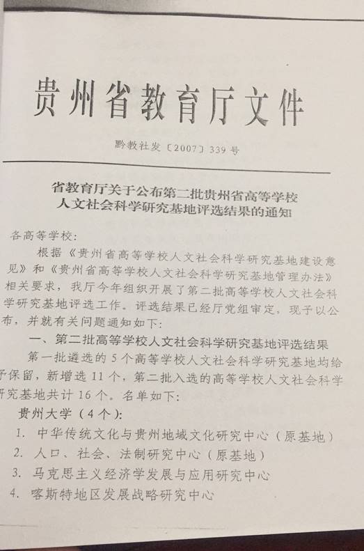 省教育厅关于公布第二批贵州省高等学校人文社会科学研究基地评选结果的通知