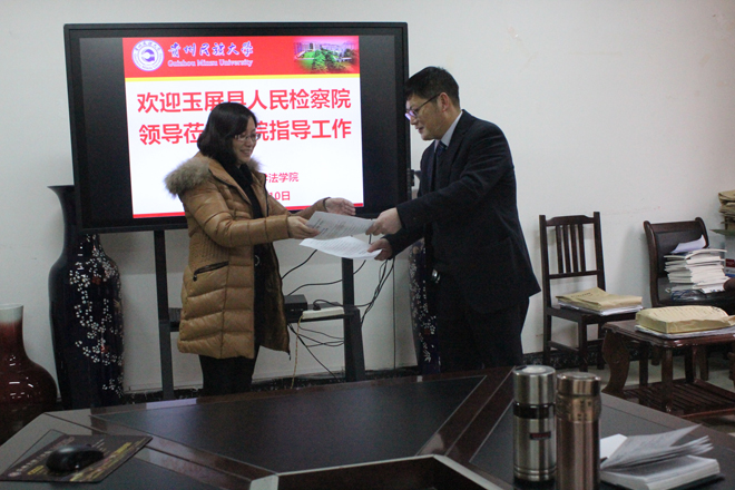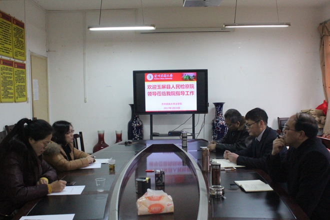 在二楼会议室召开与玉屏县人民检察院“教学实习基地”协议签约座谈会。玉屏县人民检察院政工科科长黄亚琼、肉蒲团
