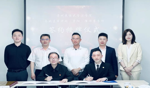 辅导员杨轶等一行莅临北京市中闻(贵阳)律师事务所举行签约授牌仪式。中闻贵阳办公室主任何先武律师、执行主任冯阳律师、执委会副主任刘乙霖律师及许灿律师等共同参加签约授牌仪式。