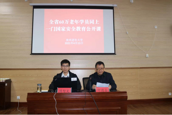 傅智文副教授应邀作《中华人民共和国国家安全法》专题教育培训。贵州老年大学胡素月副校长和全体干部职工通过现场听讲,省、市(州)老年大学学员通过线上收听直播课的方式参加。讲座由老年大学人事教育处何德全处长主持。