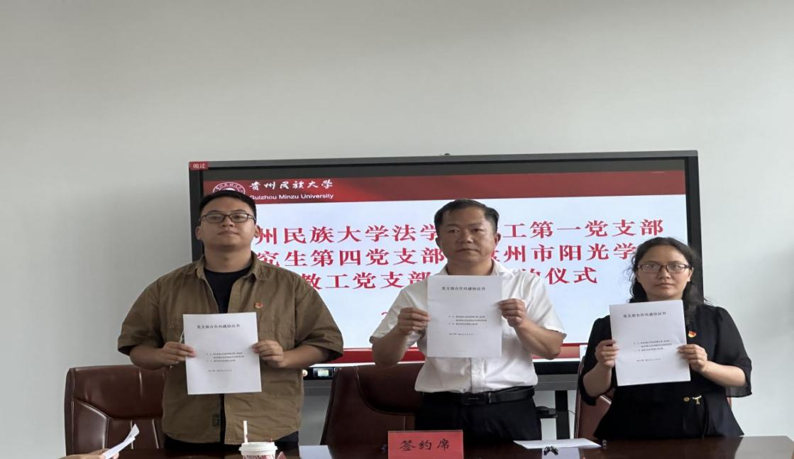 教工第一党支部书记陈雪梅、研究生第四党支部书记余凡嘉,盘州市阳光学校教工党支部书记陈利江分别介绍了支部成员构成、特色项目及过往成就,通过深度交流,不仅增进了彼此了解,还激发了创新合作的灵感,为即将开展的共建活动规划出多元化、实效性强的框架蓝图,切实增强了党建工作的活力与实效。随后,在庄重而热烈的气氛中,双方代表签订了党支部共建合作协议,标志着党支部共建合作活动正式启动。