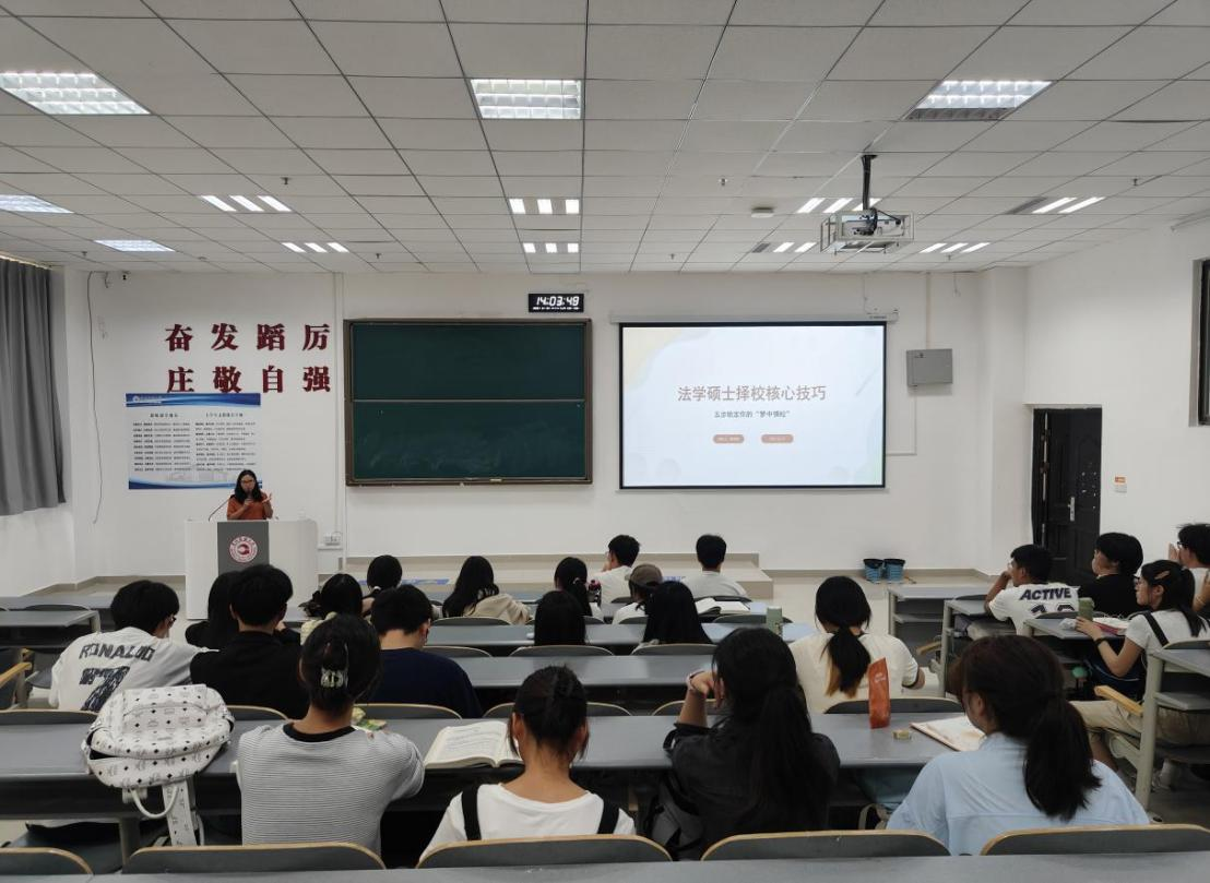 教工第一党支部书记陈雪梅在北校区第一教学楼114教室分别为法学本科专业2022级(1)班和(2)班同学举办,“考研·法考·考公”备考策略的专题讲座,共享知识盛宴。