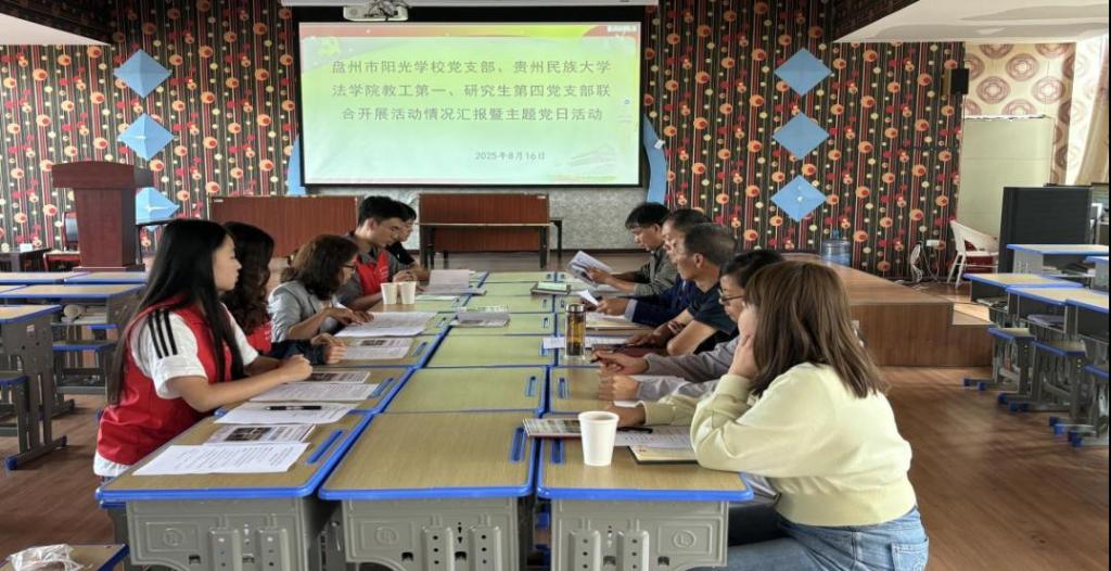 教工第一党支部、研究生第四党支部在盘州市阳光学校大教室联合开展“守护明天,法治护航”三下乡活动总结暨“法育护苗·德润初心”主题党日活动。活动由盘州市阳光学校教工党支部书记陈利江主持,盘州市阳光学校领导、当日在岗党员、表演学生及肉蒲团