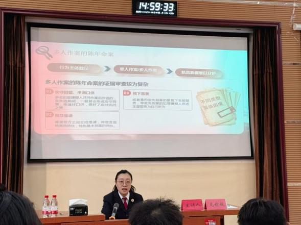 龙婧媛检察官首先提出,陈年命案指故意杀人、强奸等致死犯罪中,嫌疑人到案时间距案发超十年的案件,此类案件因案发久、侦查基础弱,普遍面临证据残缺、程序遗留等问题。随后,她结合4起典型案例,剖析立即案发型与延迟案发型、单人与多人作案等类型案件的证据构建难点。针对证据审查核心,她聚焦四类关键证据展开:口供审查需坚持“合法性优先、真实性补强”,运用“变时间、地点、人员、方式、机关”的“五变法则”固定证据。此外,龙婧媛检察官结合最高检案例解读《刑事诉讼法》适用要点,分享应对翻供、非法证据排除的经验,并勉励学生:司法公正需扎实专业功底与坚韧信念,既要深耕理论,也要关注实务新挑战,成长为有温度的法律人。